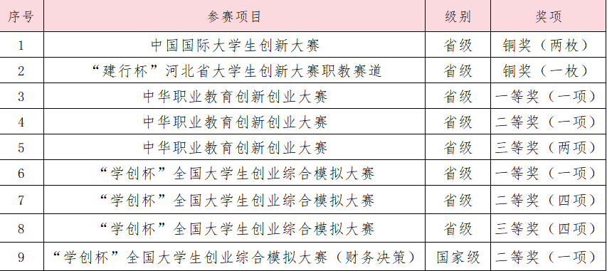 “学创杯”全国大学生创业综合模拟大赛:付汀浩、段凤、王淇、苏珊珊、谢晓晴等人指导团队在省赛中荣获1项一等奖,4项二等奖,4项三等奖,苏珊珊指导团队在财务决策赛项中首次入围全国总决赛,荣获全国二等奖。